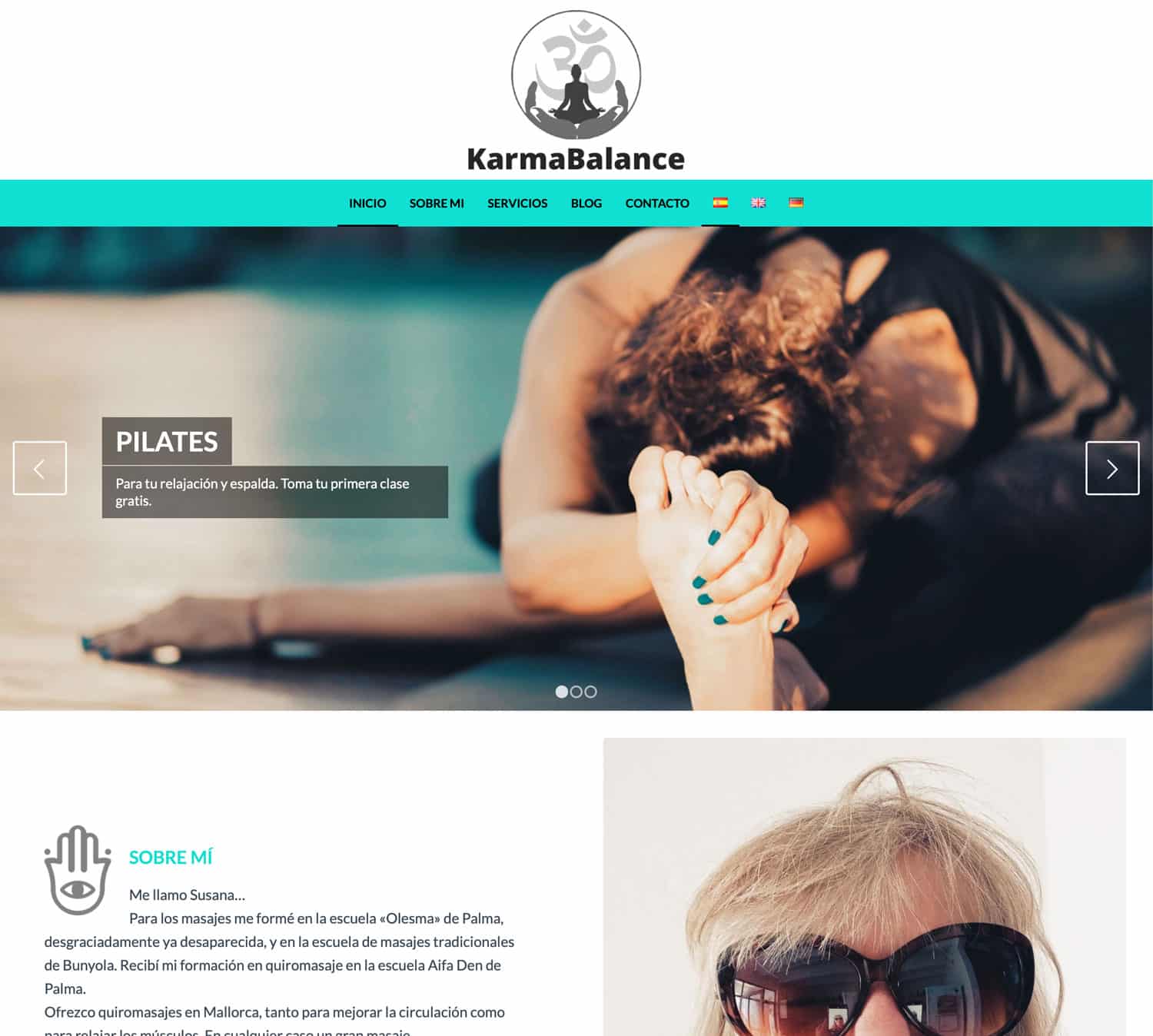 Diseño de la página web para Karmabalance, que ofrece servicios de Masajes y Pilates en Mallorca, además de Quiromasaje, Reflexología, Piedraterapia, Exfoliación corporal y Presoterapia.